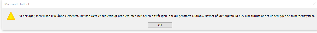Navnet på det digitale id blev ikke fundet af det underliggende sikkerhedssystem Published 16/01/2019 at 1215 × 127 in Vi beklager, men vi kan ikke åbne elementet. Det kan være et midlertidigt problem, men hvis fejlen opstår igen, bør du genstarte Outlook. Navnet på det digitale id blev ikke fundet af det underliggende sikkerhedssystem